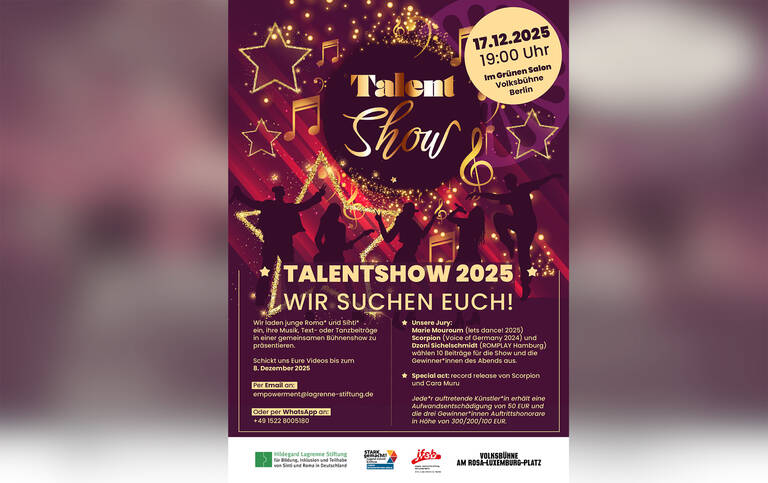 09.12.2025: Der„Berliner Roma und Sinti Jugendbeirat“ richtet erstmals eine Talentshow aus und lädt junge Roma und Sinti ein, ihre Musik-, Text- oder Tanzbeiträge in einer gemeinsamen Bühnenshow zu präsentieren.