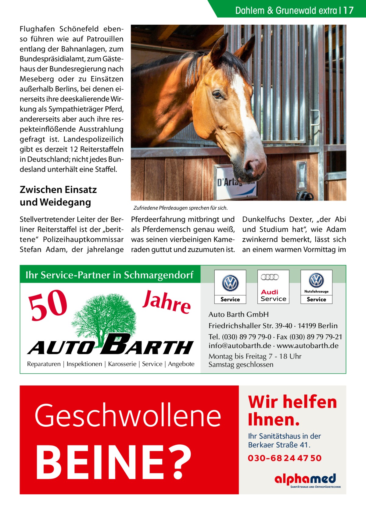 Dienstpferde vor ungebetenen Gästen. Und so können nicht nur die Stall-Bewohner des neuen Domizils ruhig schlafen, sondern auch Pferdefreunde, die die dienstleistenden Vierbeiner hier in artgerechter Versorgung und Unterbringung wissen. Indessen wartet das ehemalige BIM-verwaltete Domizil im Grunewald auf seine Nachnutzung. Derzeit wird überlegt, während der anstehenden Sanierung des Polizeiabschnittes 43 in Nikolassee die Polizeidirektion 4 aus der Alemannenstraße vorübergehend in die Büroräume des verwaisten Anlage an der Koenigsallee 75 zu verlegen.� ◾ � Jacqueline Lorenz