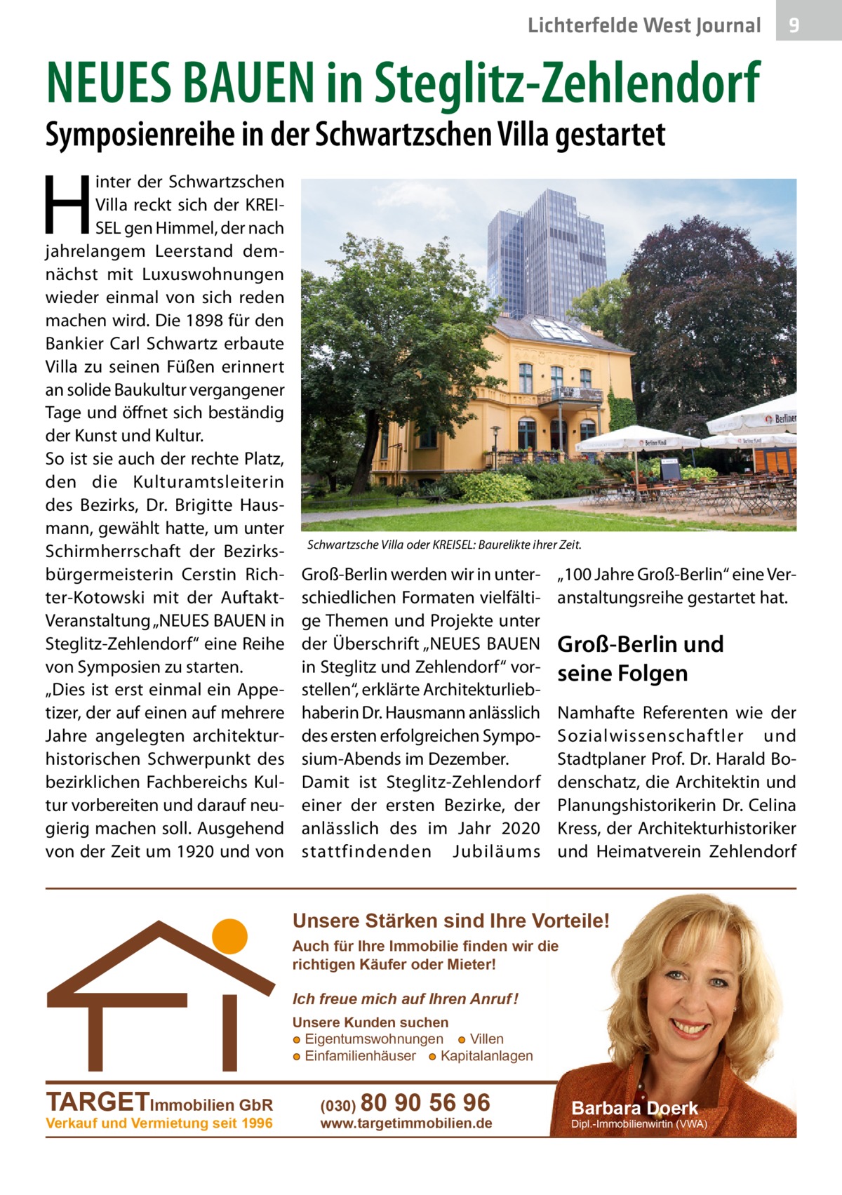 Groß-Berlin werden wir in unterschiedlichen Formaten vielfältige Themen und Projekte unter der Überschrift „NEUES BAUEN in Steglitz und Zehlendorf“ vorstellen“, erklärte Architekturliebhaberin Dr. Hausmann anlässlich des ersten erfolgreichen Symposium-Abends im Dezember. Damit ist Steglitz-Zehlendorf einer der ersten Bezirke, der anlässlich des im Jahr 2020 stattfindenden Jubiläums