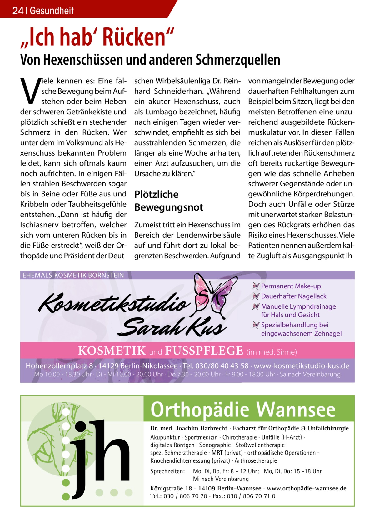von mangelnder Bewegung oder dauerhaften Fehlhaltungen zum Beispiel beim Sitzen, liegt bei den meisten Betroffenen eine unzureichend ausgebildete Rückenmuskulatur vor. In diesen Fällen reichen als Auslöser für den plötzlich auftretenden Rückenschmerz oft bereits ruckartige Bewegungen wie das schnelle Anheben schwerer Gegenstände oder ungewöhnliche Körperdrehungen. Doch auch Unfälle oder Stürze mit unerwartet starken Belastungen des Rückgrats erhöhen das Risiko eines Hexenschusses. Viele Patienten nennen außerdem kalte Zugluft als Ausgangspunkt ih EHEMALS KOSMETIK BORNSTEIN Permanent Make-up Dauerhafter Nagellack Manuelle Lymphdrainage für Hals und Gesicht Spezialbehandlung bei eingewachsenem Zehnagel