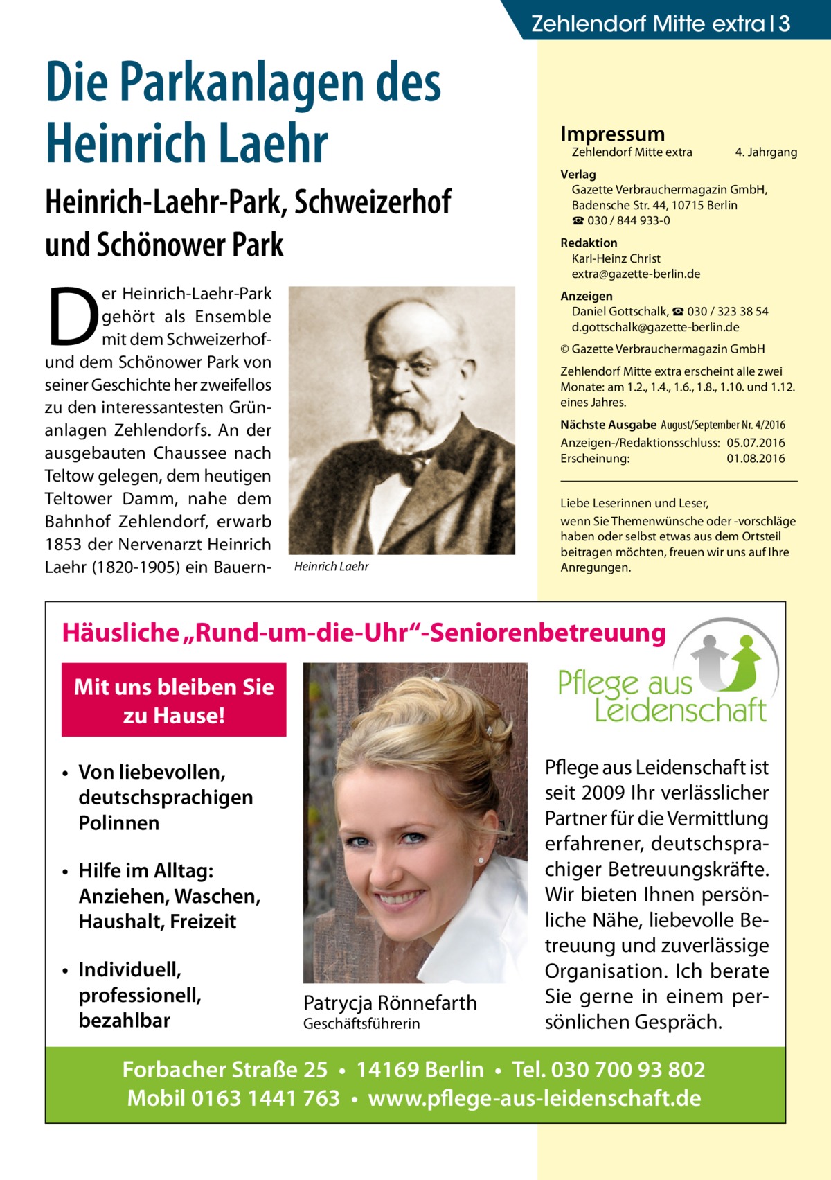 Verlag Gazette Verbrauchermagazin GmbH, Badensche Str. 44, 10715 Berlin ☎ 030 / 844 933-0 Redaktion Karl-Heinz Christ extra@gazette-berlin.de Anzeigen Daniel Gottschalk, ☎ 030 / 323 38 54 d.gottschalk@gazette-berlin.de © Gazette Verbrauchermagazin GmbH Zehlendorf Mitte extra erscheint alle zwei Monate: am 1.2., 1.4., 1.6., 1.8., 1.10. und 1.12. eines Jahres. Nächste Ausgabe August/September Nr. 4/2016 Anzeigen-/Redaktionsschluss: 05.07.2016 Erscheinung: 01.08.2016